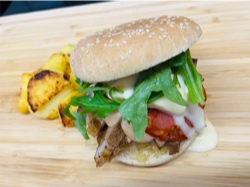 Burger mit Schweinesteak, Chorizo und St. Marcellin