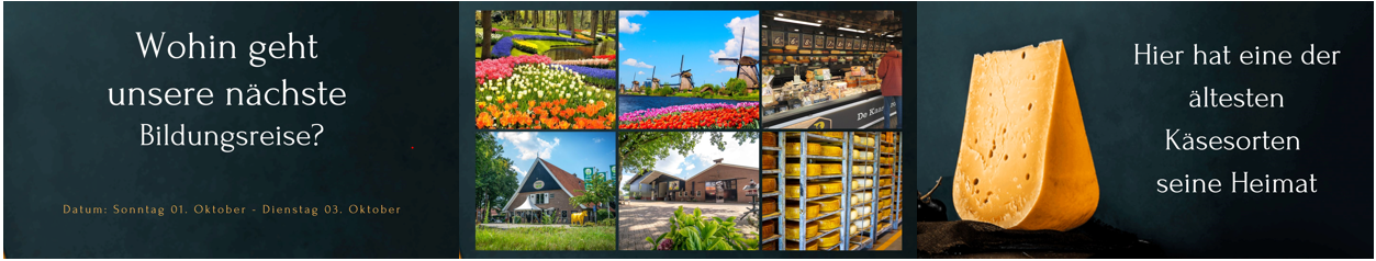 Wie du sicher bereits gelesen hast, wird uns unsere diesjährige Bildungsreise im Zeitraum 01.10. - 03.10. in die Niederlande führen. Lass uns gemeinsam die dortige Käsekultur jenseits von jungem Gouda erkunden und bei einem lecker Kaas gute Gespräche führen. Details zur Reise findest du unter der Rubrik "Termine" auf unserer Homepage.