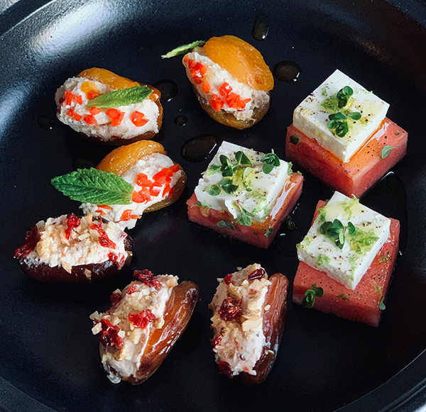 Zutaten für ca. 8-10 Personen: 1 Packung Frischkäse, ca. 200 g(ohne Bindemittel etc.) Saft von einer Orange 1 EL getrocknete Berberitzen (oder auch Cranberries) 100 g Walnusskerne 1 EL Honig (Akazie) 1 TL Zimt gemahlen Evtl. nach Geschmack 1-2 TL Rosenwasser Cayennepfeffer, Salz Ca. 20 getrocknete Medjool-Datteln oder auch frische Datteln, wenn verfügbar