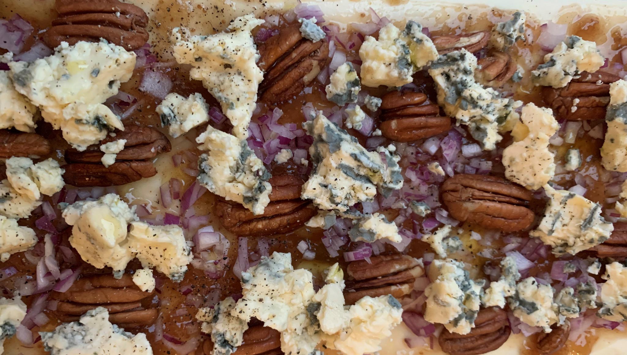Zubereitung: Backofen auf 220 Grad Temperatur (Ober-/Unterhitze) vorheizen. Zwiebel fein würfeln. Blätterteig aus der Verpackung nehmen und der Länge nach einmal falten. Mit dem Backpapier auf das Backblech legen und die seitlichen Ränder ein wenig hoch drücken, damit später der Belag nicht runterläuft. Den Blätterteig mit Feigenkonfitüre bestreichen. Zwiebelwürfel und Pekannüsse darauf verteilen, dann den Blauschimmelkäse darüber bröckeln. Das Ganze mit wenig Olivenöl beträufeln, pfeffern und in ca. 20 Minuten braun und knusprig backen. In der Zwischenzeit die Feigen waschen und in Schnitze schneiden. Die Konfitüre in einem Topf erwärmen und die Feigen dazugeben. Nur kurz kochen und vom Herd nehmen. Die Blätterteig-Schnitte in Stücke schneiden. Mit der Kresse und den Feigen garnieren.