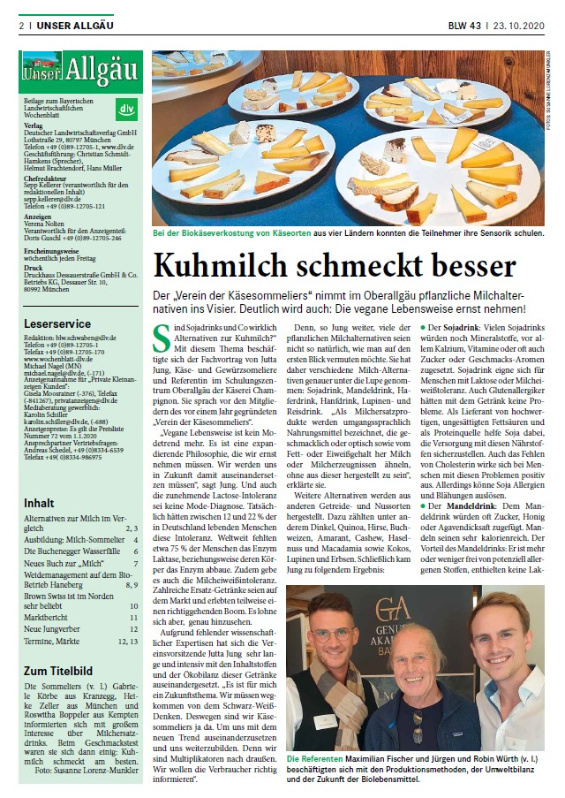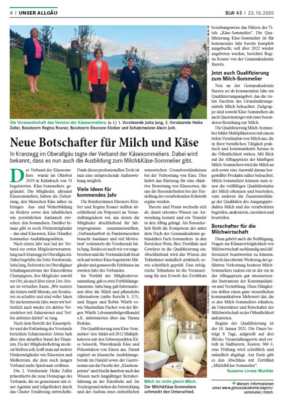 Die Fachjournalistin Susanne Lorenz-Munkler besuchte uns für die Beilage "Unser Allgäu" des Bayerischen Landwirtschaftlichen Wochenblatts beim Update der Genussakademie und unserer Mitgliederversammlung. Sie war ehrlich interessiert an den Inhalten. Hier findet Ihr ihre ausführlichen Berichte darüber sowie drei Covergirls alias Milchmädchen aus unserem Verein ;-)